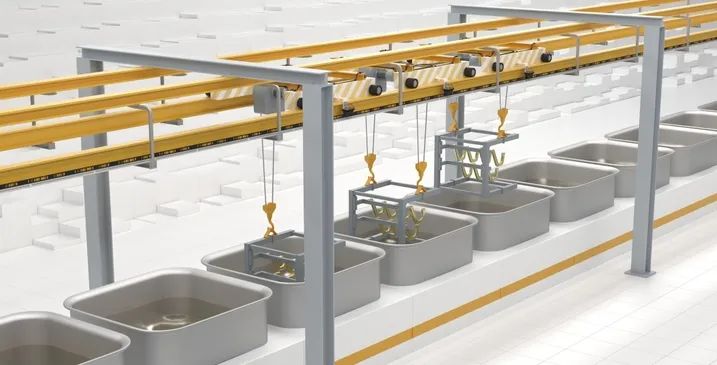 1.目标为保证电镀车间的工作顺利进行,必须以正确的顺序将要涂覆的工件浸入每个浸泡池中,此过程需要可靠地定位货物、运输工具和电镀货架,即使轨道复杂有弯道、上升、下降和中断等情况。由于其极端的环境,定位系统必须耐化学腐蚀且非常坚固。