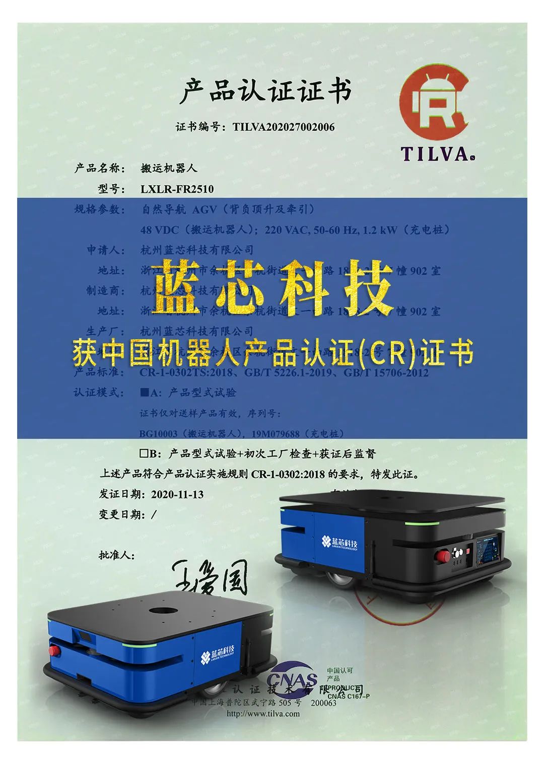 近日,蓝芯科技的机器人产品获得中国机器人产品认证(CR)证书。