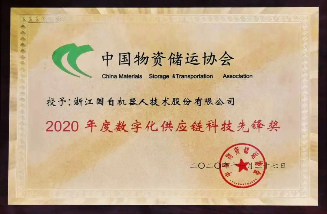 2020年11月27日,由中国物资储运协会主办的2020第七届中国储运发展高峰论坛在山东烟台隆重召开,同期公布了“2020年度数字供应链企业”评选结果。国自机器人凭借在数字供应链方面的创新成果,荣获“2020年度数字供应链科技先锋奖”,中国物资储运协会李勇昭会长等行业领导为获奖企业颁奖授牌。