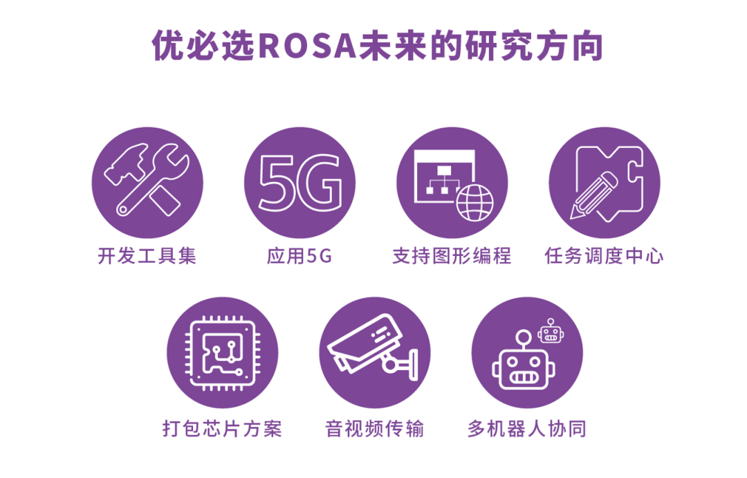 在偏向场景的业务应用上,ROSA作为操作系统框架,更好地完成开发工具集,涉及模拟器、编译系统等优化;基于AI大算力和云边端架构,让ROSA更好地运用5G高速通信;研究图形编程,结合不同业务来对机器人任务进行规划或者是编制;在任务调度中心,更好地管控机器人的状态、位置、信息等。在偏向技术化的应用上,让ROSA打包业界成熟和先进的芯片方案,共同带动机器人生态;遇到困难时,通过音视频传输快速接入机器人排除故障;最后,每个机器人的能力和构造都是不同的,当一个任务需要多种能力解决时,需要达成多机器人协同通信。