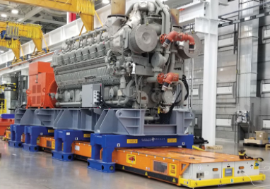 AGV还配备了一个液压平台,用于在生产过程中提升和降低工厂的重型燃气发动机。内置平台可将设备上下提升4英寸。四轮组的AGV拥有四个相应的气缸,能够提升40000磅,而六轮组的带有六个气缸的车型可以提升到100000磅。距离测量传感器可以监控液压平台的提升运动,以确保平台是出于水平的安全状态。