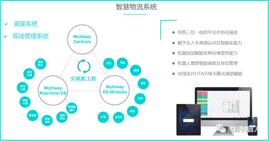 劢微机器人凭借:基于对行业深刻理解的 优良架构,毫米级的高精定位导航,业界最高 速度的行驶控制,大规模的机器人集群调度及机器视觉等方面的技术优势,拥有业界领先的技术方案及产品能力。