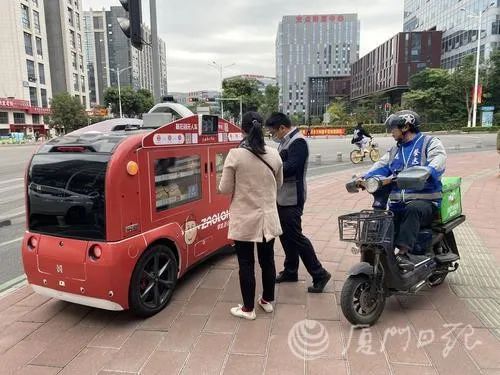 朱哲说,每天清晨5时30分,公司将打包好的餐品送到湖里创新园,放入无人早餐车内。早晨7时,无人早餐车将会自动触发前往园区内的售卖点位。朱哲跟在一旁查看售卖情况,解答顾客疑问。现在试运营,早餐套餐组合和价格一直在调整。
