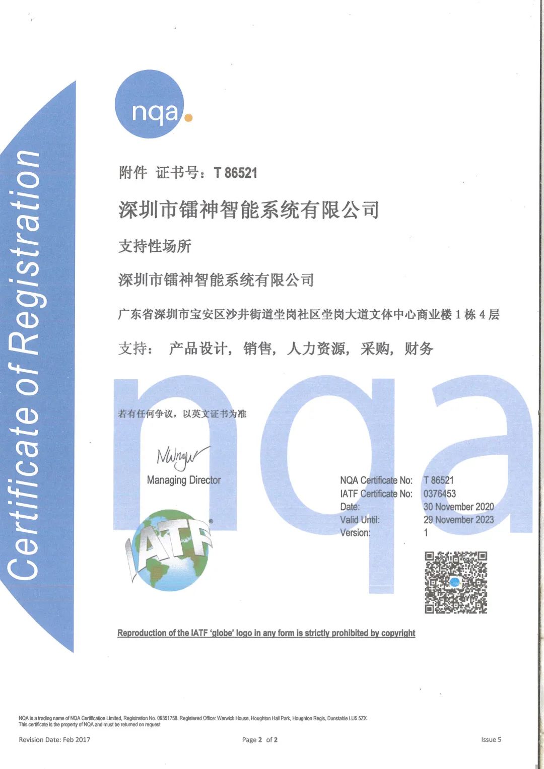 为进一步开拓市场、提升高品质要求和质量管理能力,镭神智能在原来ISO9001质量体系的基础上,进一步推行IATF16949的质量管理体系要求,从体制上为客户提供更完备、可靠的质量保证。