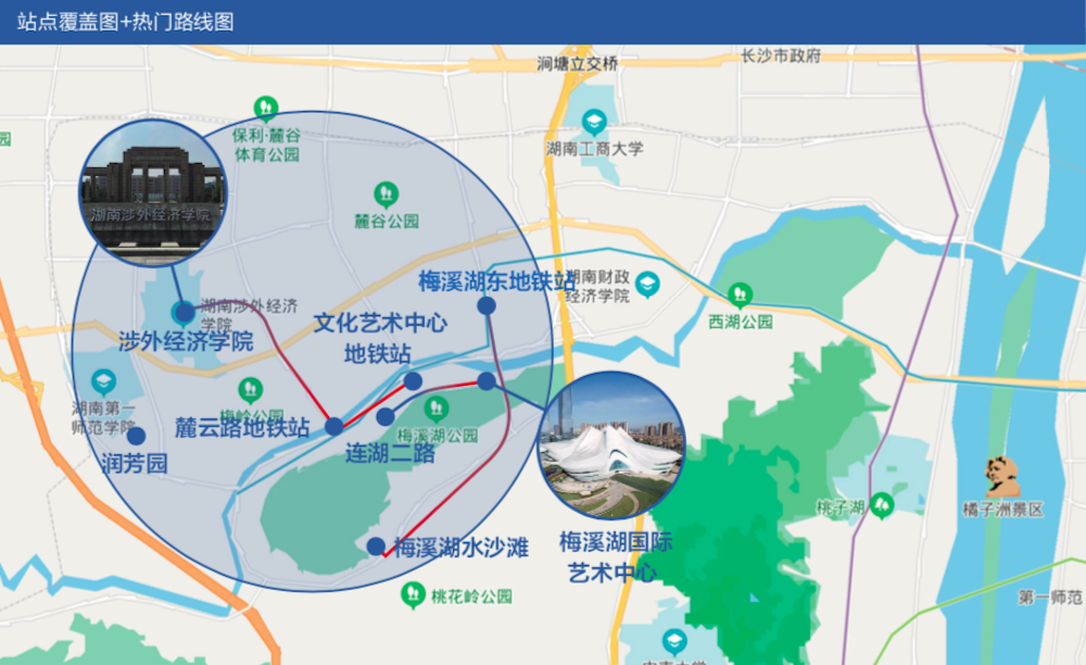 ▲百度无人车站点覆盖图+热门路线图(长沙)
