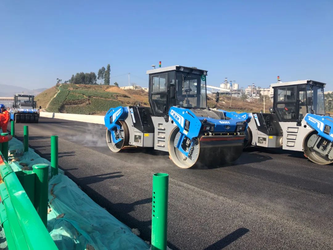 现场机械群由2台高等级摊铺机、3台双钢轮压路机、2台胶轮压路机共7台无人设备组成,在长1公里的双向路面上,进行摊铺碾压作业,错列有序。