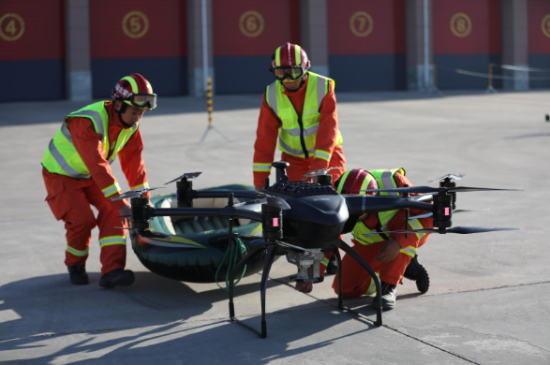 “我们现在是模拟水域救援救生设备抛投,用无人机投送救援艇、救生圈、救生衣等设备受外力影响较小,用时短、速度快,基本上能够实现零误差精准投放,能够为救援赢得充足时间。”呼和浩特市消防救援支队无人机分队负责人介绍了这款无人机在水域救援中的优势。