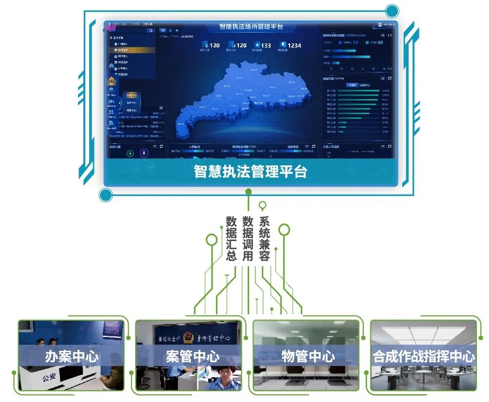 高新兴智慧执法管理平台是围绕执法办案过程中的“人、案、情、物、场、卷”进行集约化、标准化的管理,真正实现了对于办案中心、案管中心、物管中心的统一管理,实现执法业务全覆盖、执法全要素数字化、执法全环节服务智能化、执法全场景规范化的整体规范管理。