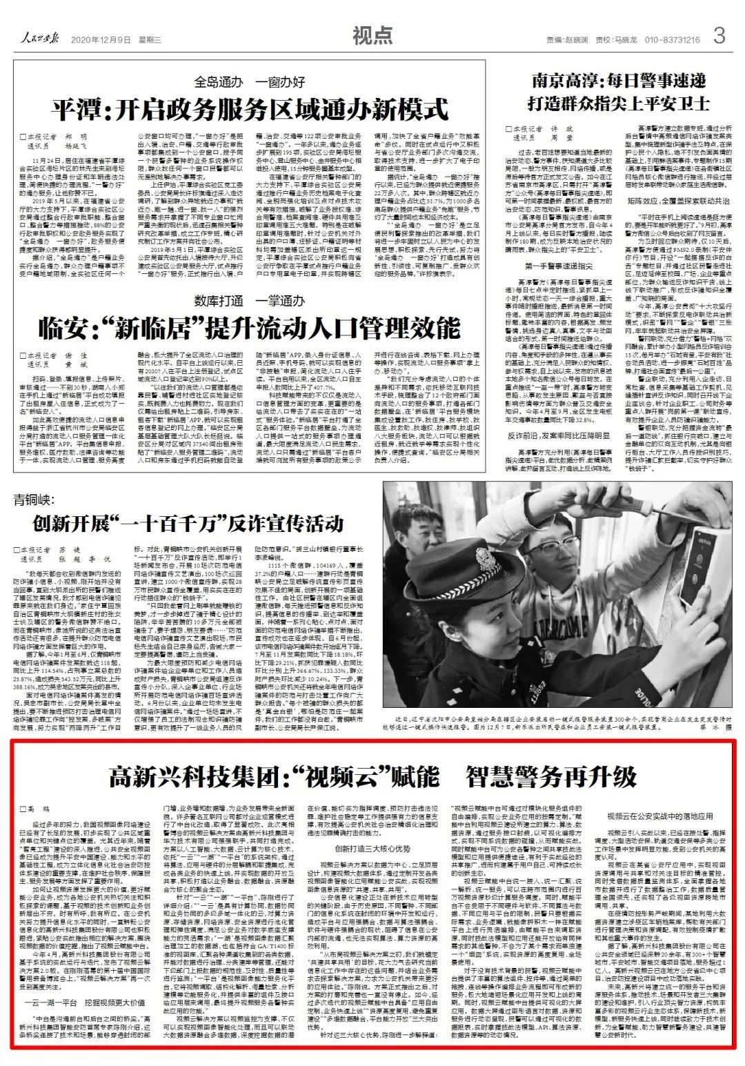 其中,高新兴与华为合作的视频云解决方案引起现场专业观众的高度关注,人民日报社记者特别就该方案采访了高新兴科技集团,并于今日(2020年12月9日)《人民公安报》第03版重磅刊出。
