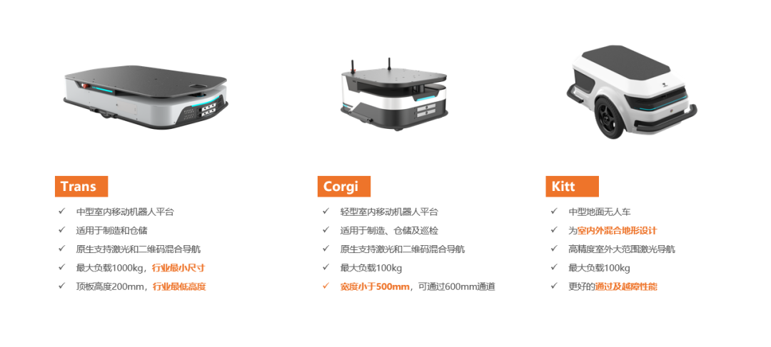 Corgi:轻型室内移动机器人,能够通过 600mm的狭窄通道,车体通过ROSH测试,可适用于Class100级别无尘车间内工作。