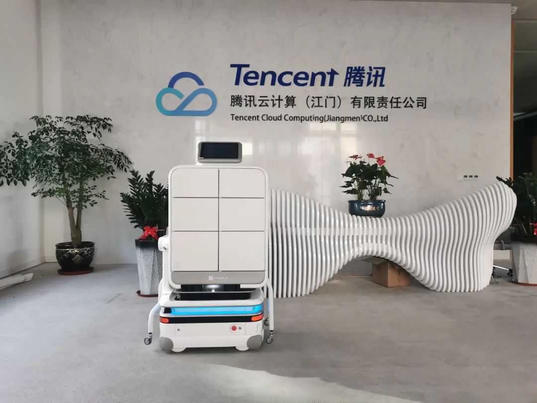 近日,烛光机器人进驻江门人才岛科技产业园(二期)项目,在1号楼、2号楼之间执行快递、外卖配送等服务。