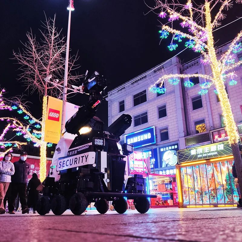 ANDI-安防巡检机器人在王府井工作时间为上午9至12点、下午13点至17点和晚上18点至22点三个时间段。夜幕降临时,ANDI机器人搭载了高清夜视摄像头和热感仪,确保夜晚的监控识别。同时,机器人配备了LED探照灯与警示灯,让夜晚巡逻更加安全。