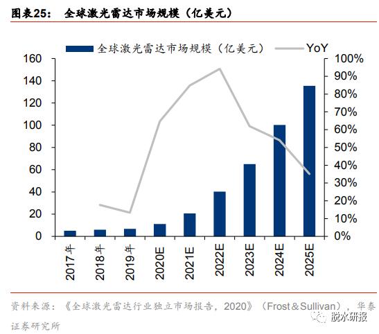 根据沙利文预测,2024年全球激光雷达市场将突破100亿美元,2025年达到135.4亿美元,2020~2025年复合增速达到64.65%。那么从下面这个图上看,2021年是市场规模加速的元年。