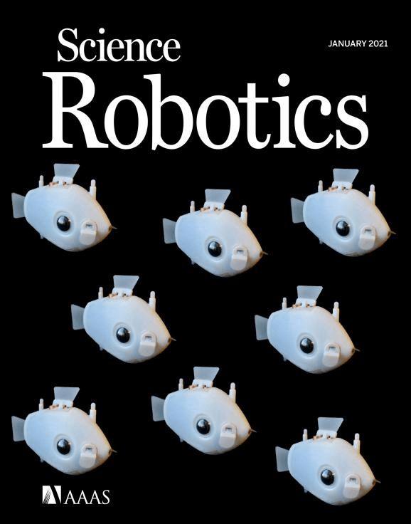 日前,来自哈佛大学的科学家们就从鱼群中汲取灵感,研发出了一批水下机器人,这种机器人可以像真正的鱼群一样同步运动,且不需要任何外部控制。同时,他们也首次利用水下机器人展示了具有隐性协调的复杂三维集体行为,该论文发表在《科学机器人》(Science Robotics)上,并被遴选为 2021 年 1 月份的月度封面。