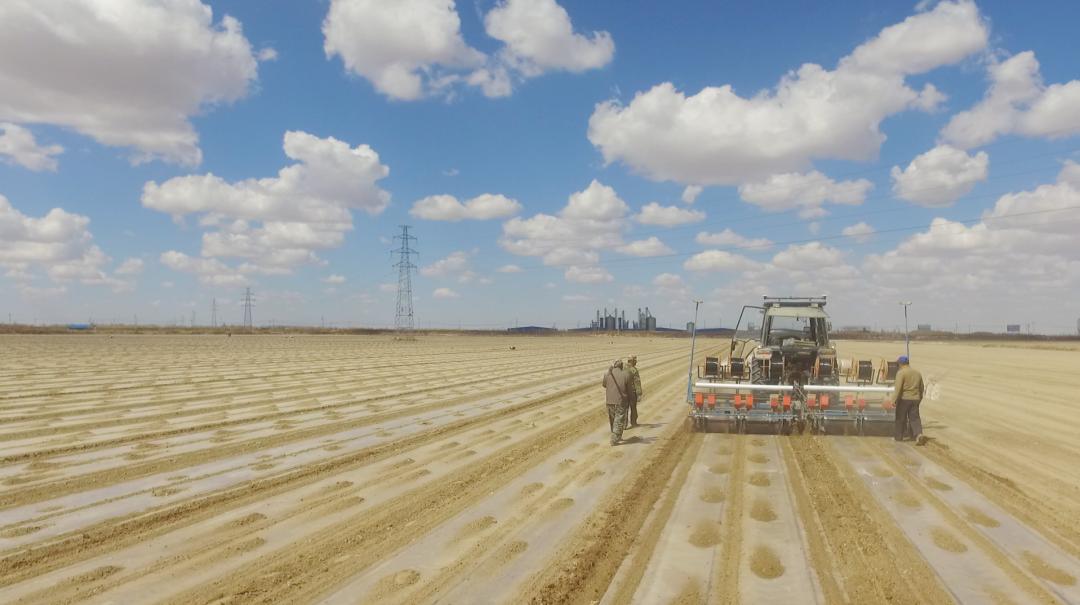 搭载自动驾驶设备的拖拉机在新疆石河子覆膜播种