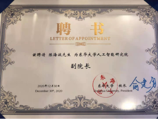 会上,刘承功、俞建勇、李陵申、钟晓敏、过浩敏、吴玉华、东华大学教授张洁、陈海波共同为东华大学人工智能研究院揭牌。同时,深兰科技创始人兼CEO陈海波受聘为东华大学人工智能研究院副院长。