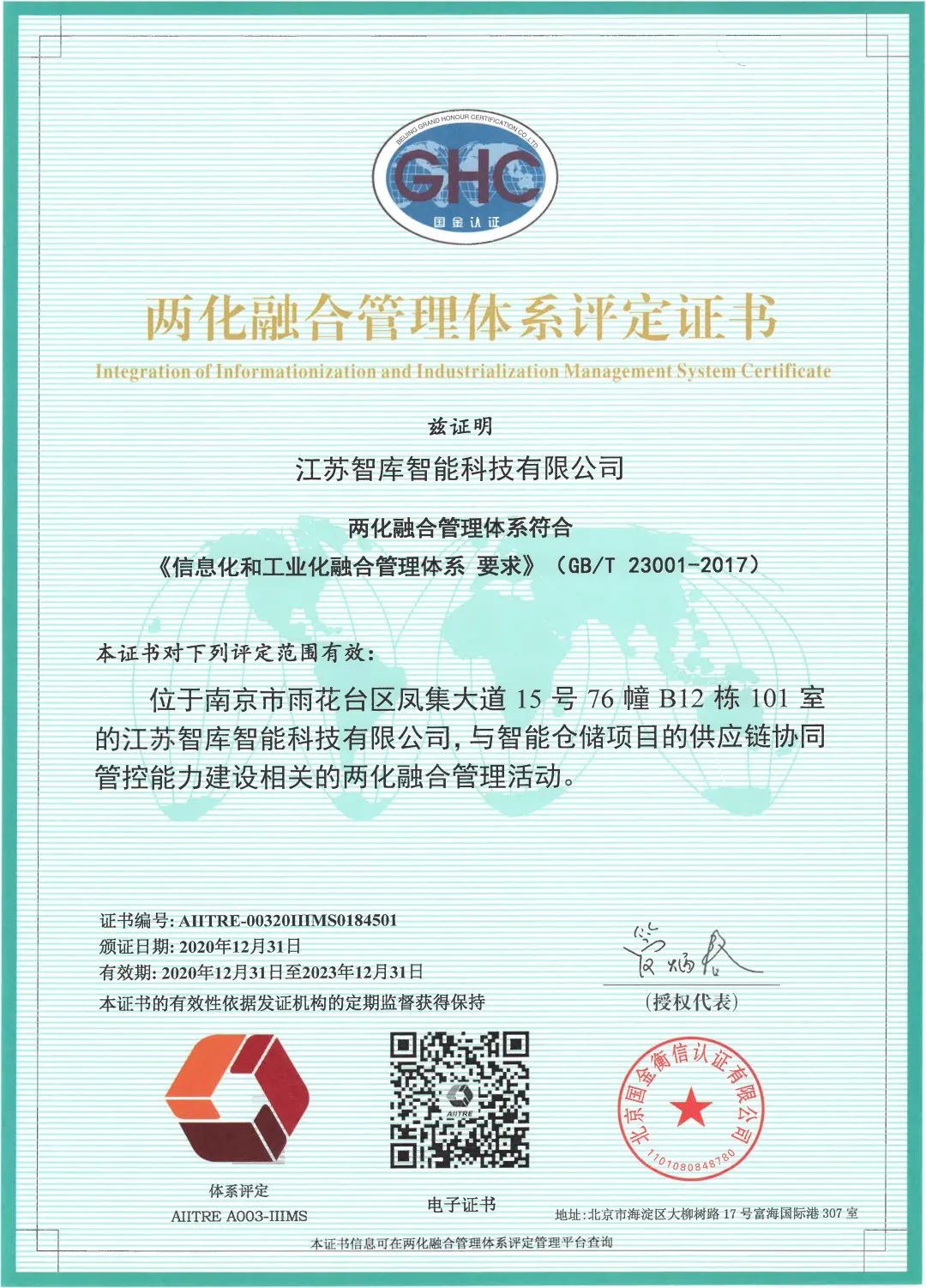 近日,江苏智库智能科技有限公司(下简称“智库智能”)顺利通过两化融合管理体系的评审和公示,并荣获“两化融合管理体系评定证书”。这标志着智库智能在推进两化深度融合方面取得显著成效,公司信息化与工业化融合迈上新台阶。