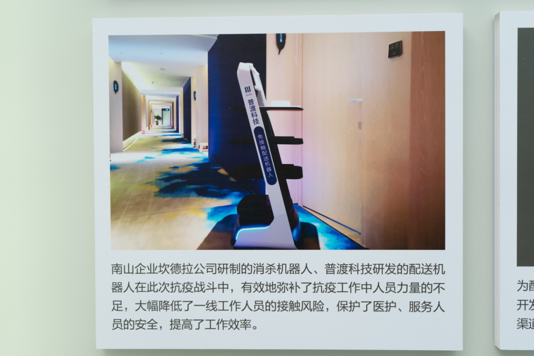 自新冠疫情爆发以来,南山区委区政府以“人民至上、生命至上”的坚强信念打响了疫情防控人民战争。近期,由南山区档案馆主办的“众志成城,南山‘战疫’”——南山区抗击新冠肺炎疫情档案图片展正式开幕,普渡机器人“欢乐送”的身影被记录于“南山高度”篇章。