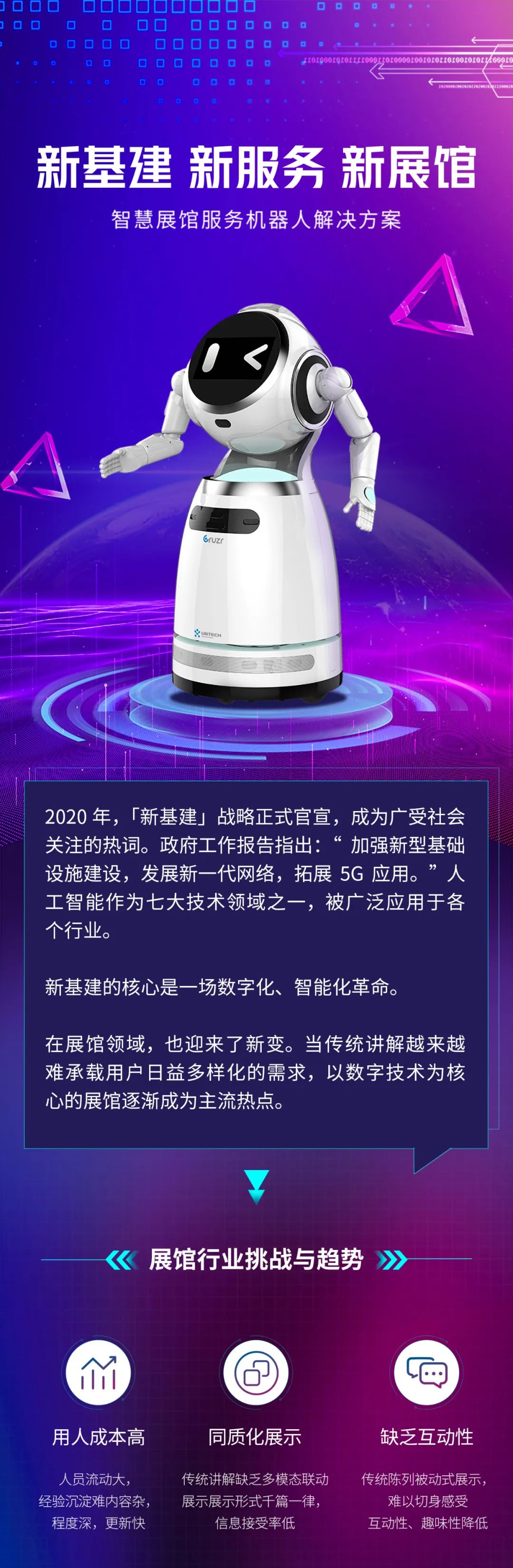 数字展馆时代来临, AI、5G、IOT、机器人等多种技术的融合将为参展观众带来知识性、互动性相结合的智慧展览体验。人工智能服务是最有爱的新基建,优必选科技以智能机器人为载体,人工智能技术为核心,打造“硬件+软件+服务+内容”的智能服务生态圈,推动经济、社会的智能化升级。