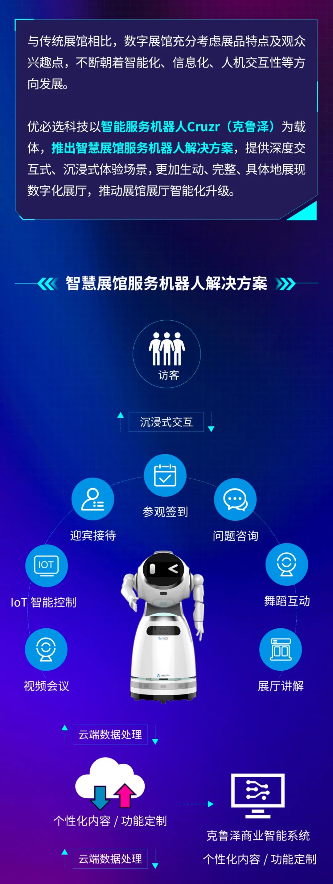 优必选科技以智能服务机器人Cruzr(克鲁泽)为载体,以人工智能技术为核心,推出智慧展馆服务机器人解决方案,助力智慧展厅实现智能升级、服务升级和展示升级。该解决方案基于人工智能技术,提供了智慧迎宾、智能导览讲解、IOT联动演示、遥控器联动演示、知识问答、参观互动等多种功能。