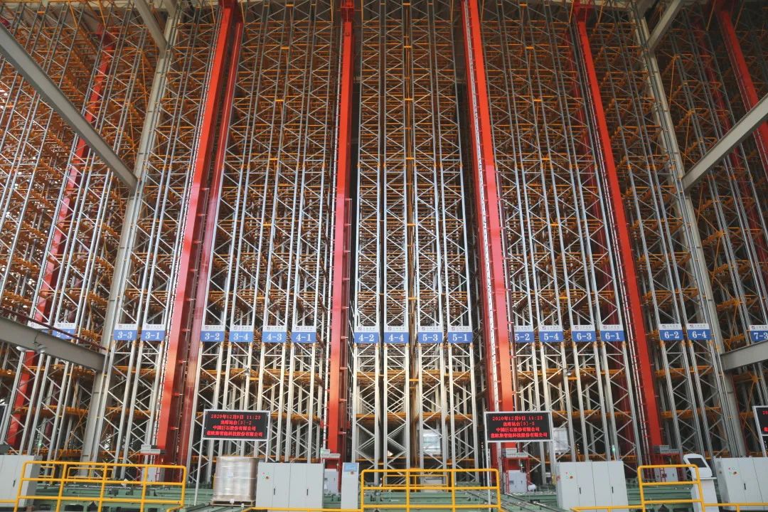 由链条输送机和滚筒输送机组成的环形输送线串联起托盘出入库流程,经过站台入库的成品托盘会由输送线输送至对应的货架巷道入口。