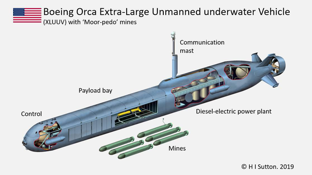HSU-001属于大排水量潜航器(简称LDUUV),但更大的超大型潜航器(简称XLUUV)正在成为新的热点,其中波音“虎鲸”是代表。这是从长度16米的波音“回声远航者”发展而来的,但插入了10米长的载荷舱,可搭载8吨载荷,总长也增加到26米。动力为柴油机-锂电池,最大航速8节,巡航航速3节,最大航程10500公里,潜航时间可达几个月之久。X形舵使得“虎鲸”很适合浅水使用。