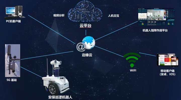 其中,园区室外5G安保巡逻机器人是一套集成环境感知、动态决策、行为控制和报警装置,具备自主感知、自主行走、自主保护等能力,利用5G高带宽、低时延等能力,可实现园区内任意位置机器人实时监控及实时控制,可帮助人类完成基础性、重复性、危险性的巡逻工作,推动安保服务升级,降低安保运营成本的多功能综合智能装备。