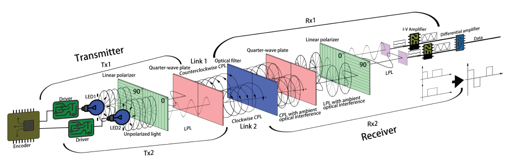 针对水下通信系统存在的通信距离短、带宽低、抗干扰能力差、收发双发具有严格的对准要求等问题,我校软件学院水下通信研究组与美国麻省大学合作开展研究,首次将圆偏振光(Circularly Polarized Light, CPL)引入水下光通信系统的研制中,设计并实现一种双信道的圆偏振光通信系统,有效解决抗干扰和对准问题。我校参与研究人员包括软件学院林驰、王雷、吴国伟和罗钟铉等。