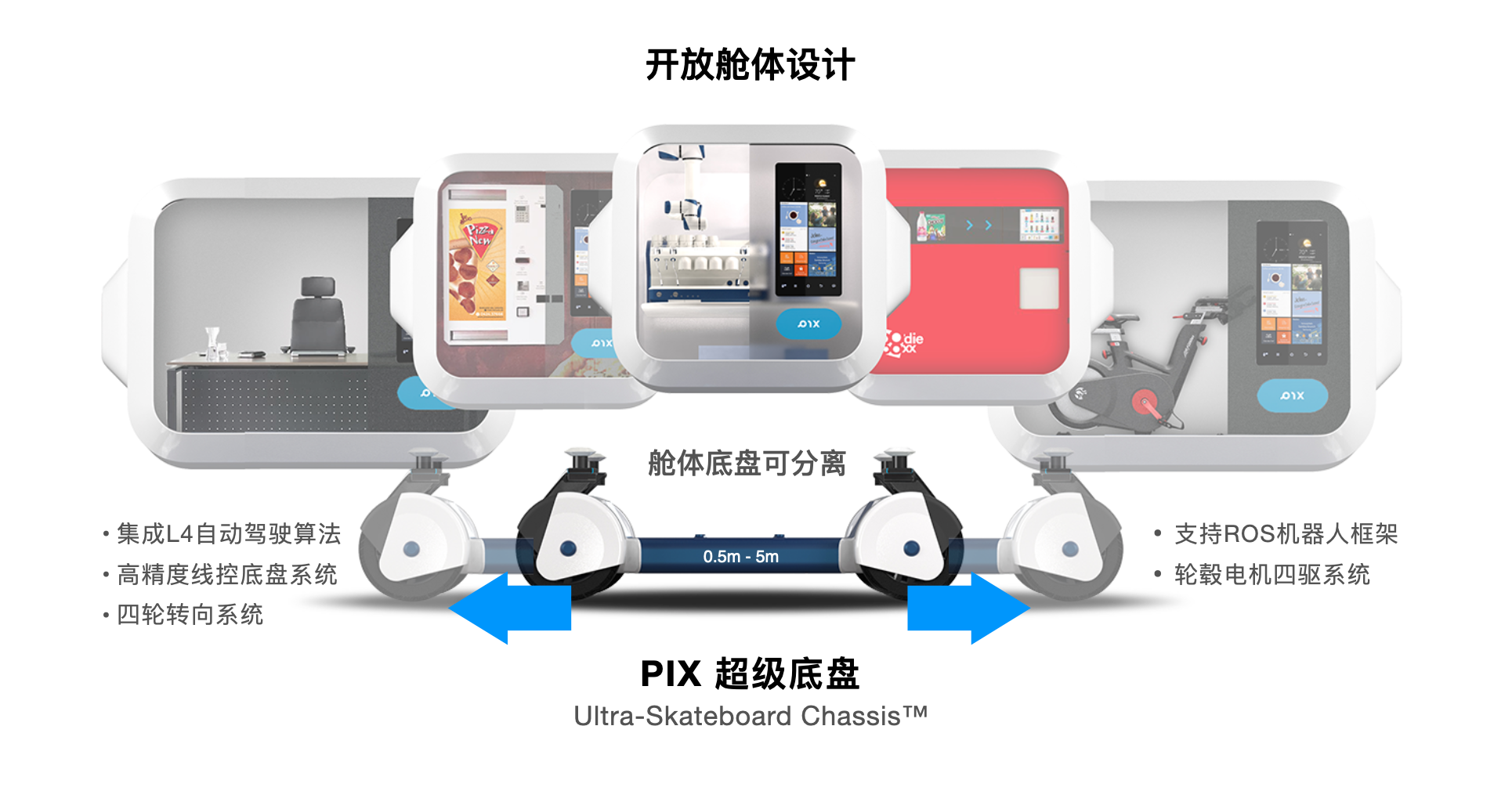PIX 超级底盘模块化架构满足长度 0.5m-5m、载重 15kg-5000kg 范围,覆盖全场景