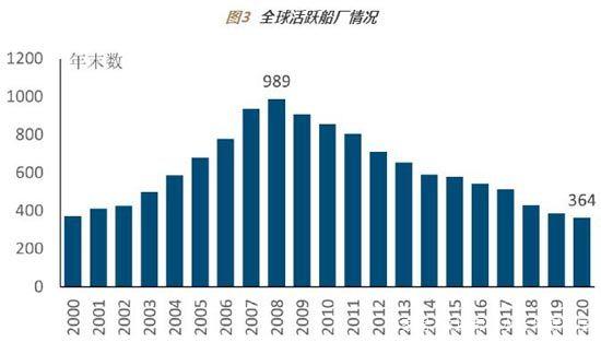 由于船市低迷,中小造船企业产能持续出清,截至2020年末,全球活跃船厂(至少有一个1000GT以上的手持订单)数量仅为364家,相比于巅峰期的989家下降了63%。全球前十大造船集团接单量占全球市场份额的87%,前二十大造船集团接单量占比高达96%,较2019年分别提升了7个百分点和2个百分点,全球造船业加速整合,产业集中度持续提升。与此同时,各国行业龙头加速“抱团”。目前,韩国现代重工与大宇造船海洋推进重组已获得哈萨克斯坦、新加坡与中国反垄断批准。日本联合造船与今治造船通过所有审查,将成立“日本造船”。欧洲两大邮轮建造巨头芬坎蒂尼和法国大西洋造船厂酝酿两年的合并计划也正在路上,全球新造船市场寡头竞争格局正逐步形成,头部企业争雄时代已经来临。