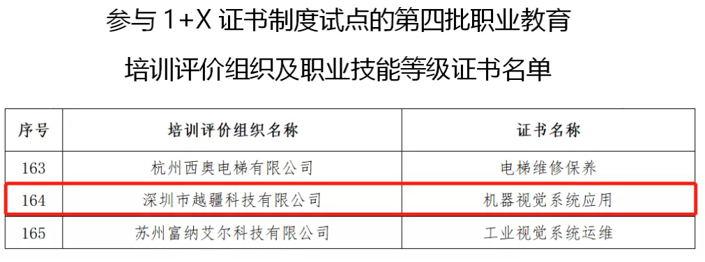 2020年12月31日,越疆科技申报的“机器视觉系统应用”职业技能等级证书成功入选教育部“1+X”证书制度试点第四批职业技能等级证书名单。