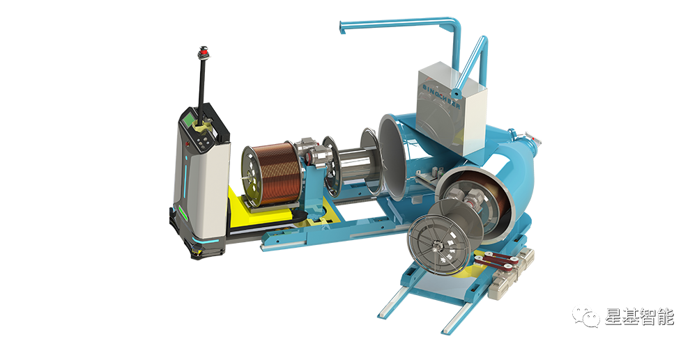 由调度系统进行分配完成点对点,点对多点等操作,并可进入机器内部(如自动收线机、绞线机、放线机等)装载线盘,定位精度可达到+/- 5mm,停止角度精度≤0.5°,使操作工只需操作按钮、穿线、接线等,彻底摆脱体力劳动。