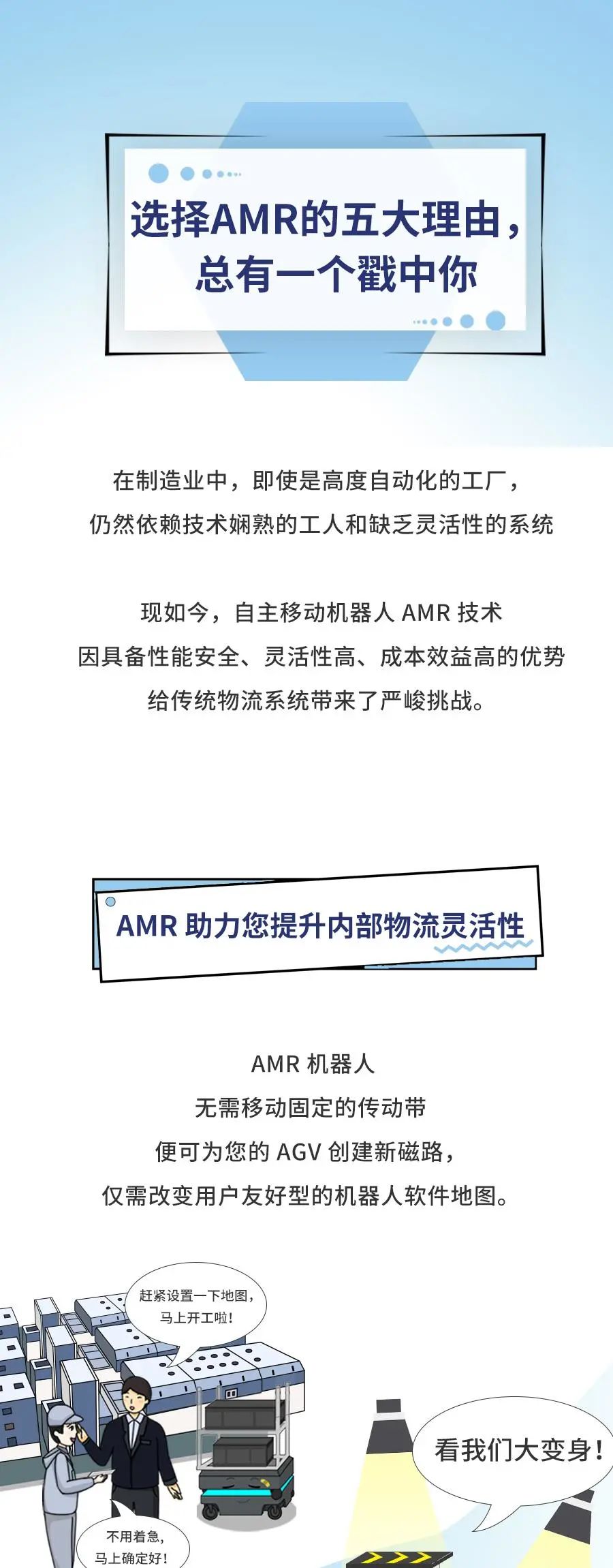 MiR自主移动机器人,旨在优化物流和制造运营中的生产力。MiR AMR让员工可以专注于更高价值的活动,有效提高他们的工作效率,同时还能缩短交付周期、降低瓶颈风险并优化安全性。自成立以来,MiR坚持每年推出一款新机器人,竭力满足客户需求。现有AMR的有效负载从100公斤到1000公斤不等,可优化从运送小零件到自动搬运重物和托盘的所有工作流程。