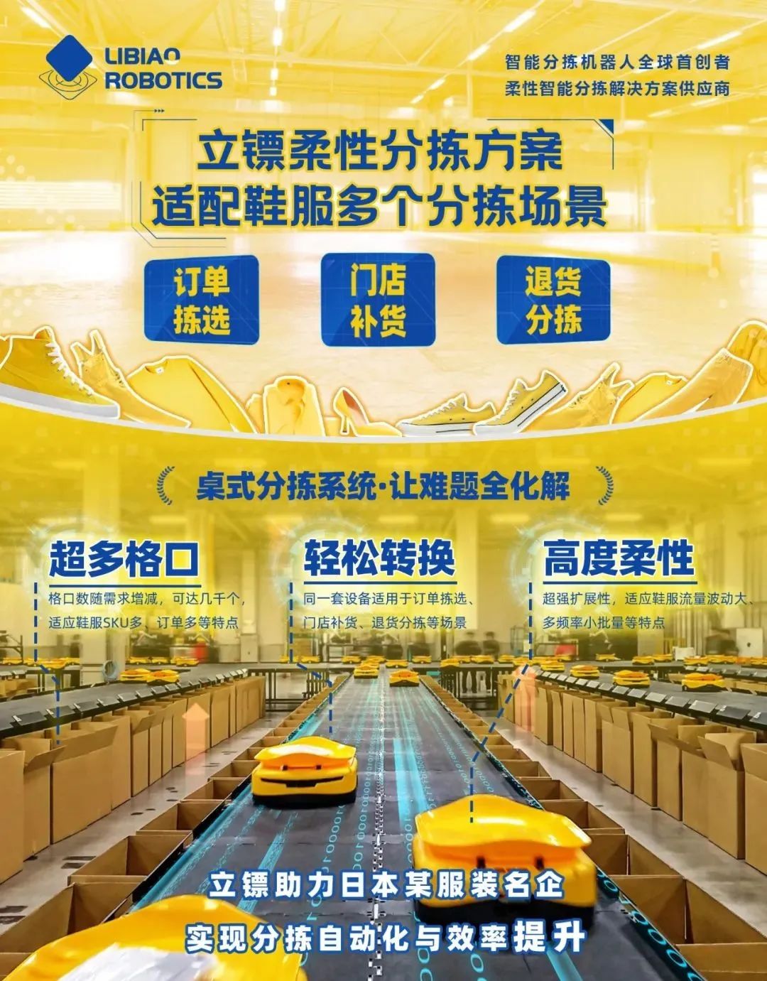立镖针对鞋服行业特点,设计多种型号的分拣机器人目前,立镖机器人的这套智能分拣解决方案,已成功应用于国内外知名服装企业的多个仓库,助力这些服装企业实现分拣自动化转型与分拣效率的提高,以适应鞋服行业越来越快的供应链需求。