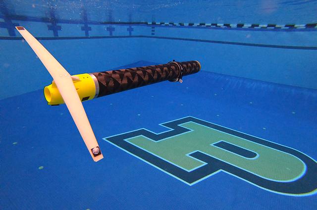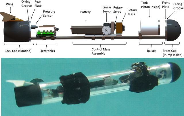 “滑翔机器人”的巧妙设计之处在于人们在外部就可以看到其运动的零部件。一个密封的四英尺长的管子中装有压载水箱,压载水箱可以充满空气或水,使其既可以漂浮在水面上,也可以沉入水中。安装在其尾翼上的机翼将机器人的上下运动转化为前进动力,而其电池则通过前后移动重量充当控制机构。最后,旋转的轨道提供了机器人侧倾时的转向能力。