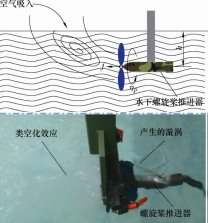 随着水下机器人技术的发展,越来越多的高难度水下作业任务均可以利用水下机器人来完成,例如水下抓取,水下焊接与水下跟踪。大多数水下机器人均采用螺旋桨推进器作为其唯一的动力源,因此,精确地实现推进器推力预测是提高水下机器人运动性能的重要因素。然而,当螺旋桨推进器近水面工作时,由于其高速旋转,会在螺旋桨与水面之间形成漩涡,将空气吸入螺旋桨内导致推进器效率极大降低,引起推力损失和噪声,这种现象被称为“类空化效应”。类空化效应的产生将极大影响机器人运动控制的稳定性,因此对于类空化效应的预测具有十分重要的意义。