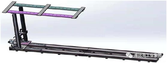 堆垛机主体结构主要由上横梁、立柱、下横梁和控制柜支座组成。上、下横梁是由钢板和型钢焊接成箱形结构,截面性能好,下横梁上两侧的运行轮轴孔在落地镗铣床一次装夹加工完成,确保了主、被动轮轴线的平行,从而提高了整机运行平稳性;立柱是由方钢管制作,在方钢管两侧一次焊接两条扁钢导轨,导轨表面进行硬化处理,耐磨性好。在焊接中采用了具有特殊装置的自动焊接技术,有效克服了整体结构的变形;上横梁焊于立柱之上,立柱与下横梁通过法兰定位,用高强度螺栓连接,整个主体结构具有重量轻、抗扭、抗弯、刚度大、强度高等特点。