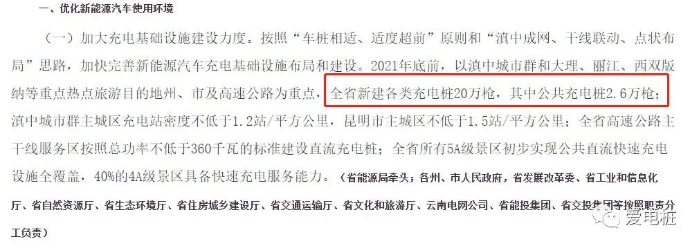根据《云南省加快新能源汽车产业发展和推广应用若干政策措施》和云南省能源局发布的《云南省能源局关于做好2020-2022年充电基础设施建设工作的通知》,2021年底前,全省新建各类充电桩20万枪,其中公共充电桩2.6万枪;昆明两年内需完成7.8万个充电桩建设,其中包括公共充电桩1万个。