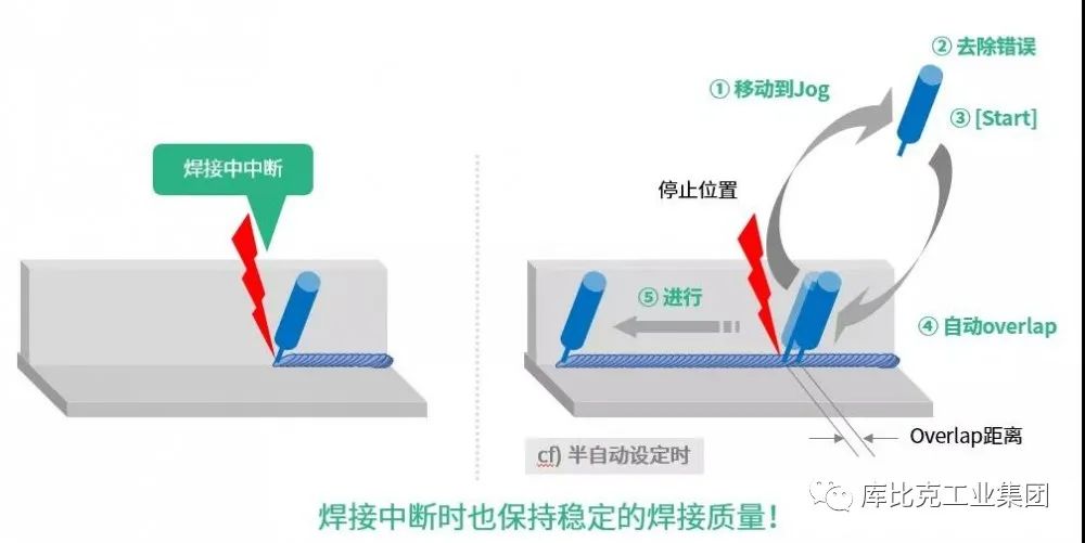 焊接进行中焊接中断时自动执行overlap功能。防止因焊接中断导致没有执行焊接的区间;新启动时为了防止钢丝过度突出,支持自动回绕功能。