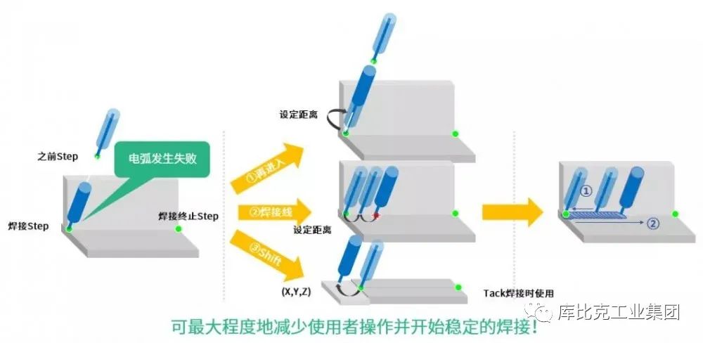 焊接开始时发生电弧失败时,尝试自动发生电弧;为了同一位置无法发生电弧的情况可设定多种重试;重试时可自动回绕钢丝防止过度突出。