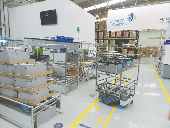 Johnson Controls Hitachi,MiR200 配备了 Karakuri 系统,连接至固定系统。机器人从仓库运出组件,再将空包装箱送回,整个过程完全自动化。