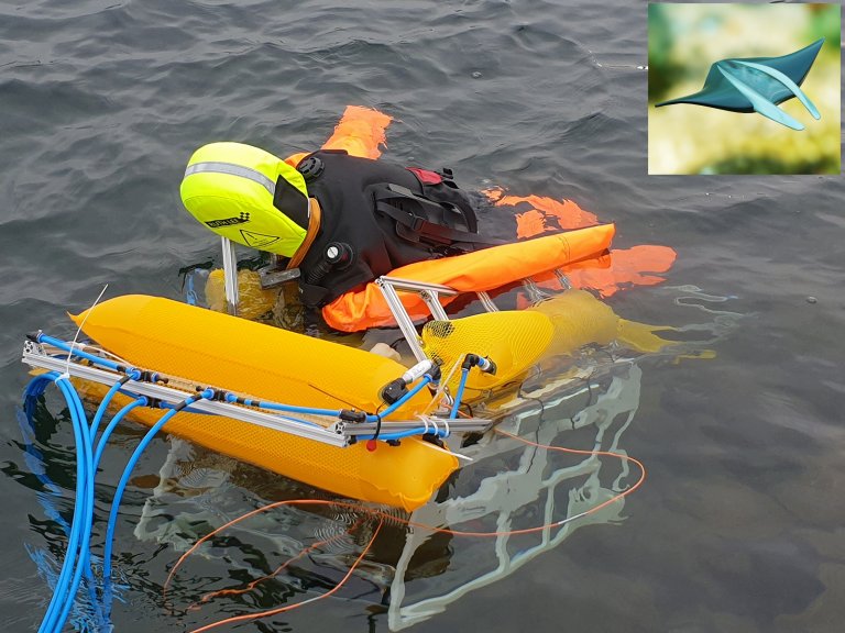 目前的原型机配备了电池、电机、摄像头以及光学和导航传感器,与仿生蝠鲼的设计相比,仍有很大差距,长90厘米,高50厘米,宽50厘米。