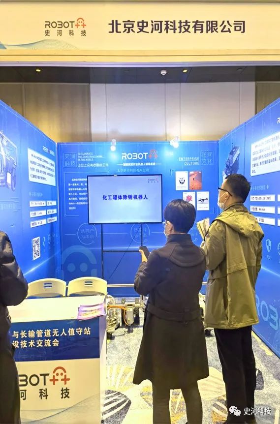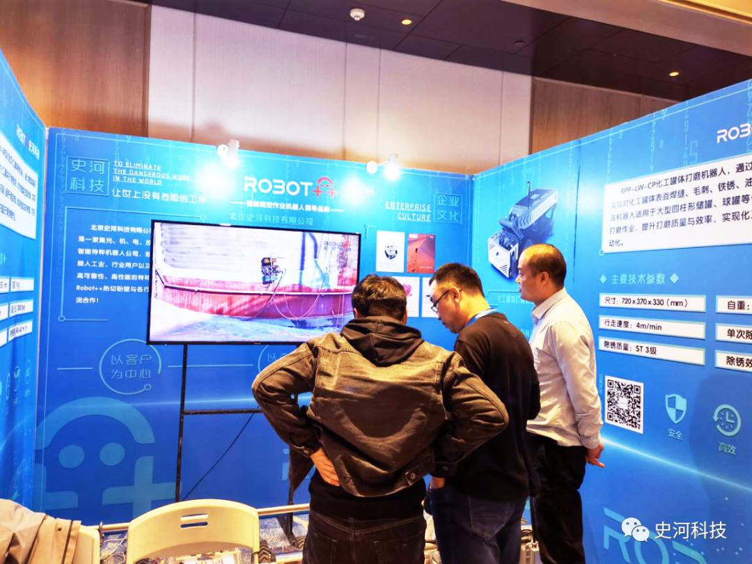 传统的原油储罐外壁防腐工作主要依靠人工作业完成,存在效率低下、作业人员安全无法保证、环保要求不能满足等问题。史河科技自主研发的化工防爆除锈防腐机器人,通过机器人实现原油储罐外壁的除锈与防腐作业,可显著改善作业环境,提升作业效率,同时安全环保。上述产品一经展出,便吸引了众多与会者的关注。