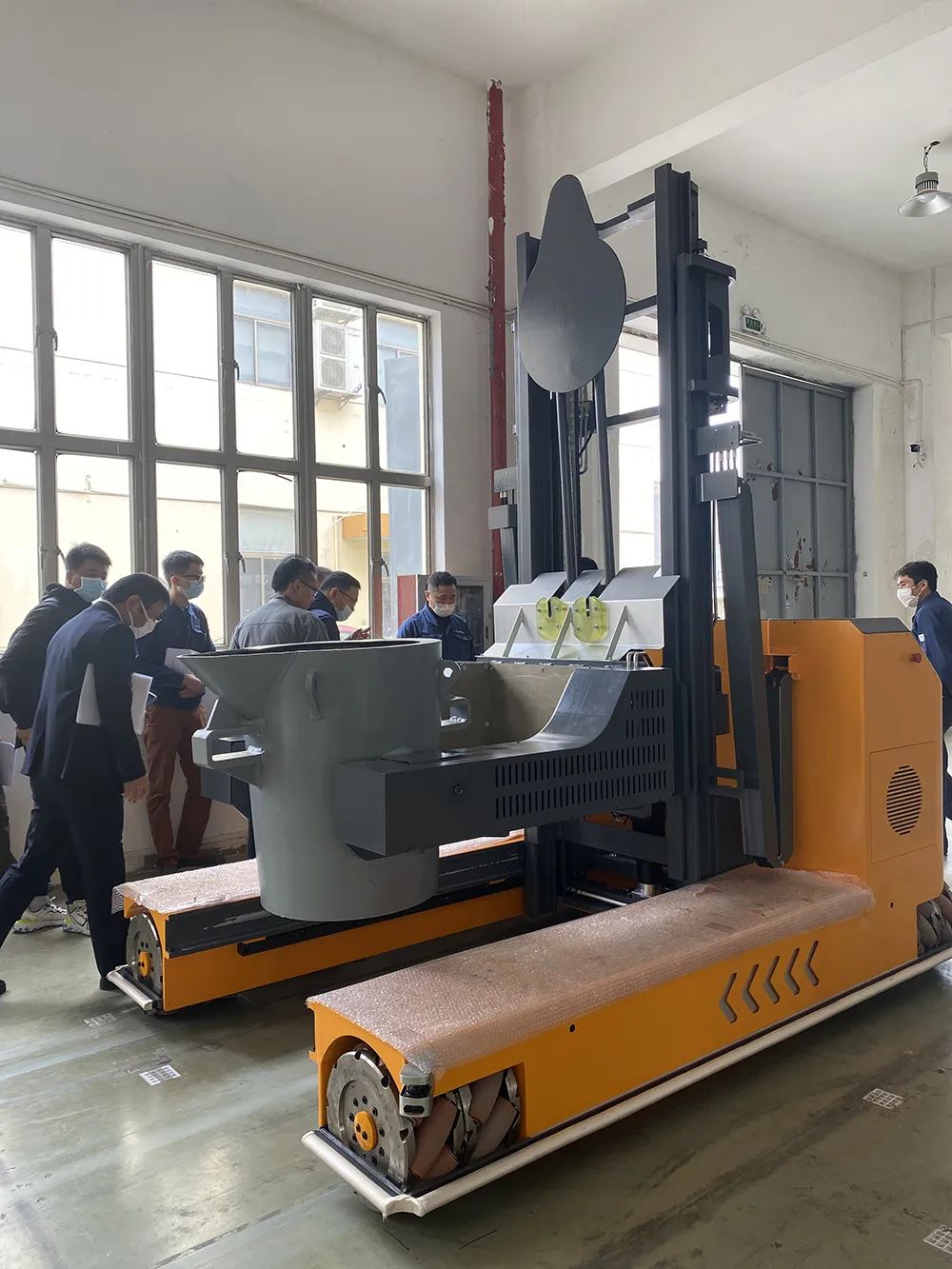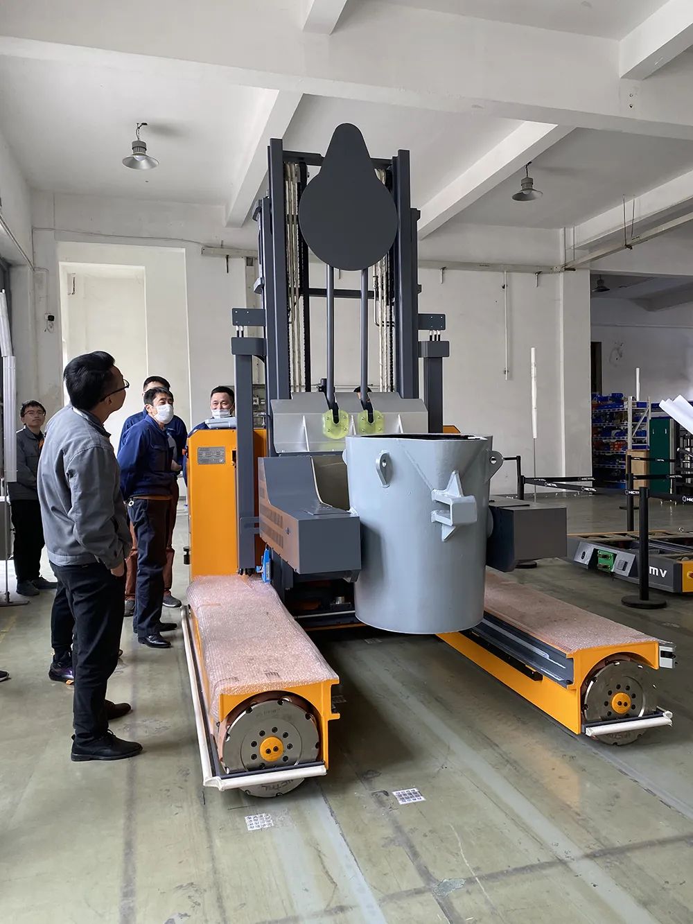 2021年3月18日终端客户已对OMV铁水运载车进行了预验收,主要对车子的全向移动功能、避障功能和铁水包倾倒动作以及整车是否可以满足生产需求等进行了检验和测试。