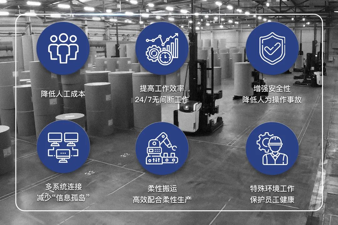 通过AGV运输纸品,实现了纸品在运输过程中可以实时被物流管理软件所监控和追踪,完全实现了与自动化仓储物流管理系统的对接。