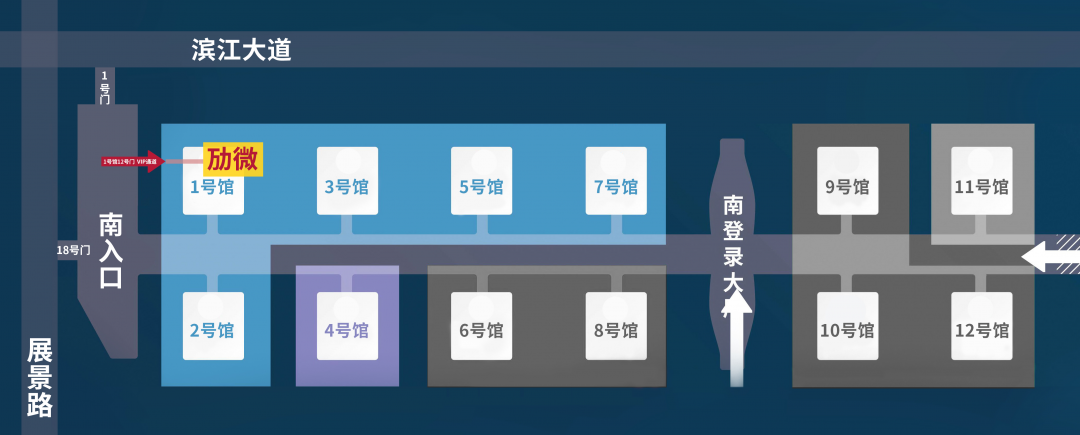 深圳国际会展中心(宝安新馆)南入口1号馆12号门VIP通道领取参会证件进入(下图为1号馆所处展会区域平面图)