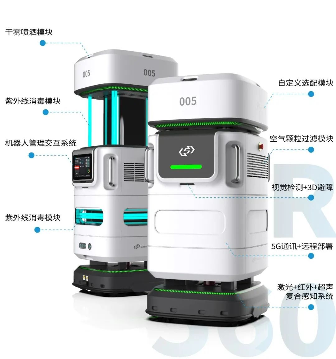 新常态全自动灵活消杀2020年,斯坦德被选中为深圳市发改委关于组织实施新冠肺炎诊疗防疫设备产业化专项的九家企业之一。作为此次专项研发重要成果,移动复合消毒机器人以激光SLAM导航移动机器人为平台,高度集成了紫外消杀、干雾发生及喷洒、过滤集尘杀菌等模块,能快速有效地对室内场景进行复合消毒杀菌作业。