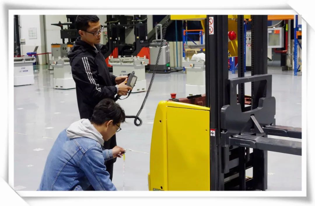 循声寻去,只见灯火通明的实验中心那里,工程部钱鸿顺、技术部李志涛还在调试车辆。彼时,一辆刚调好的AGV正被一位新员工牵去停在打包装的工位,还有两辆正在调试中。起步、停车、载重、空载、测量、记录数据、调整……调试并未因夜晚渐深而有丝毫马虎。