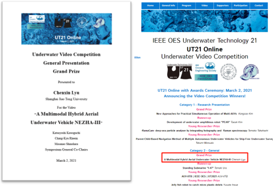 近日,“IEEE OES Underwater Technology 21 (UT21 Online) Underwater Video Competition 水下视频大赛”在线上举行。上海交通大学海洋学院的参赛作品“一种多模式海空两栖航行器-NEZHA III”获得本次大赛常规组特等奖,是本届大赛中唯一获奖的中国参赛作品。