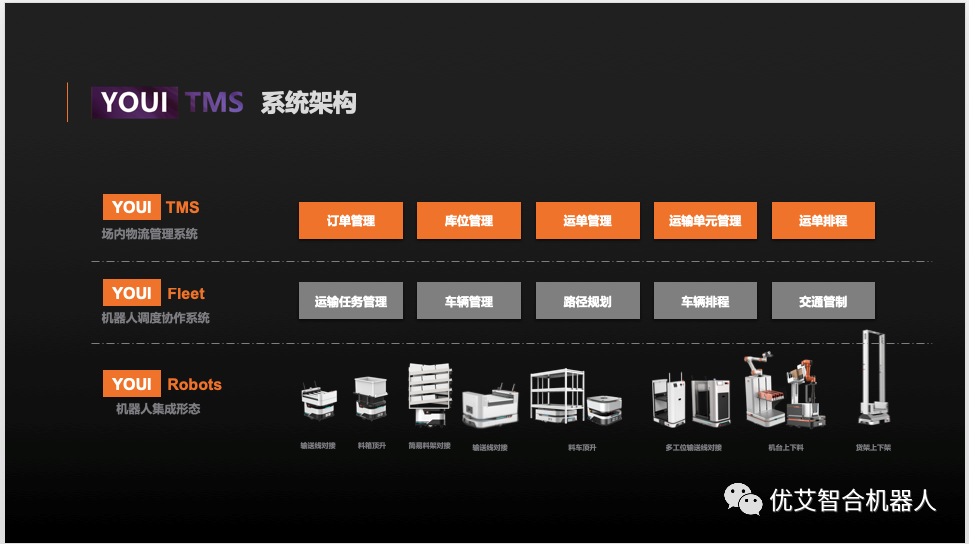 面向制造领域,优艾智合打造了从硬件到软件的一体化智能升级解决方案,即利用激光SLAM导航移动操作机器人实现生产全线自动化,通过YOUI TMS等软件系统彻底打通场内的信息流与数据流,实现从备料仓-产线-产线-成品仓完整的流通,轻松完成每一个零件的精准数据跟踪和回溯,真正做到“让场内物流精确到毫秒”。